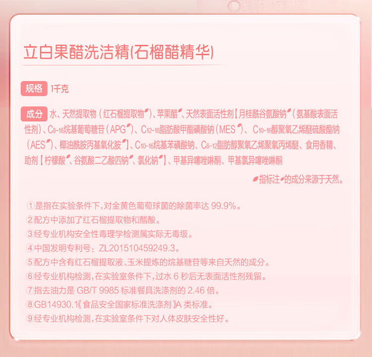 “l(fā)iby/立白”1千克 果醋洗潔精 1瓶裝(石榴果醋精華洗潔精1kg濃縮洗滌靈洗碗液A類食品用專利去油)