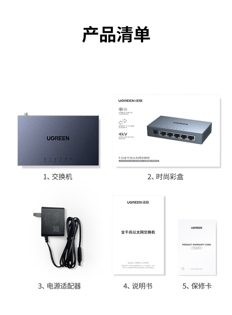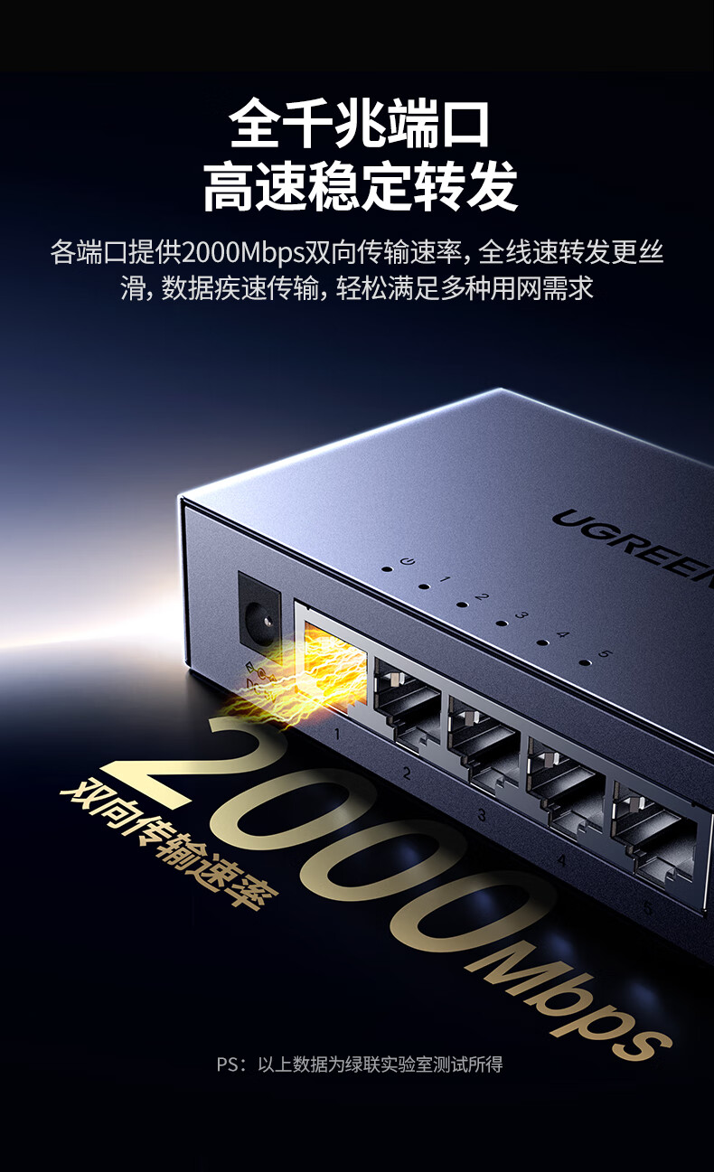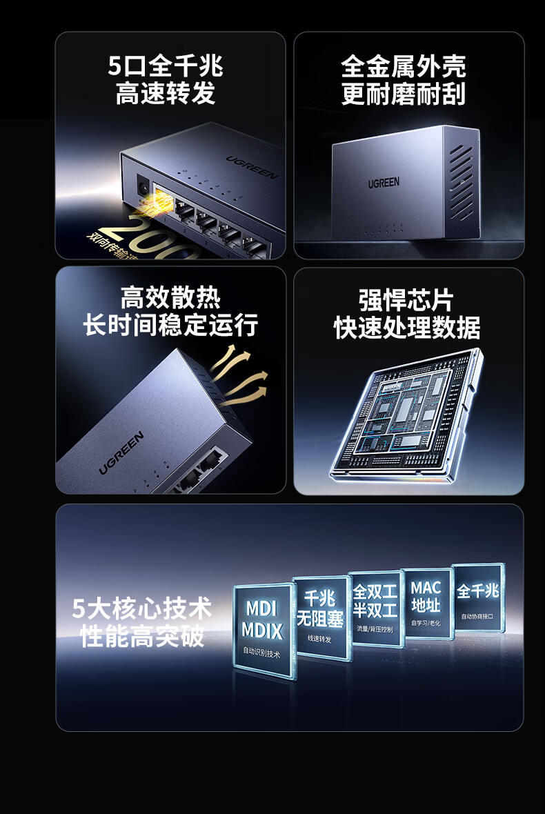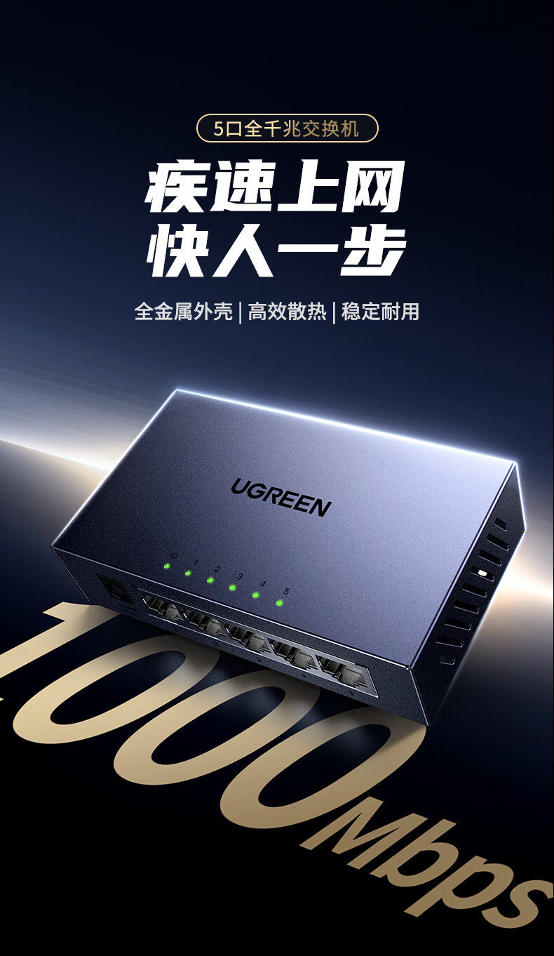 “UGREEN/綠聯(lián)”5口 千兆交換機(jī) 1臺裝(鋼殼網(wǎng)線分線器一分二/四4口監(jiān)控網(wǎng)絡(luò)轉(zhuǎn)換器交換器小型企業(yè)宿舍擴(kuò)展分流器)