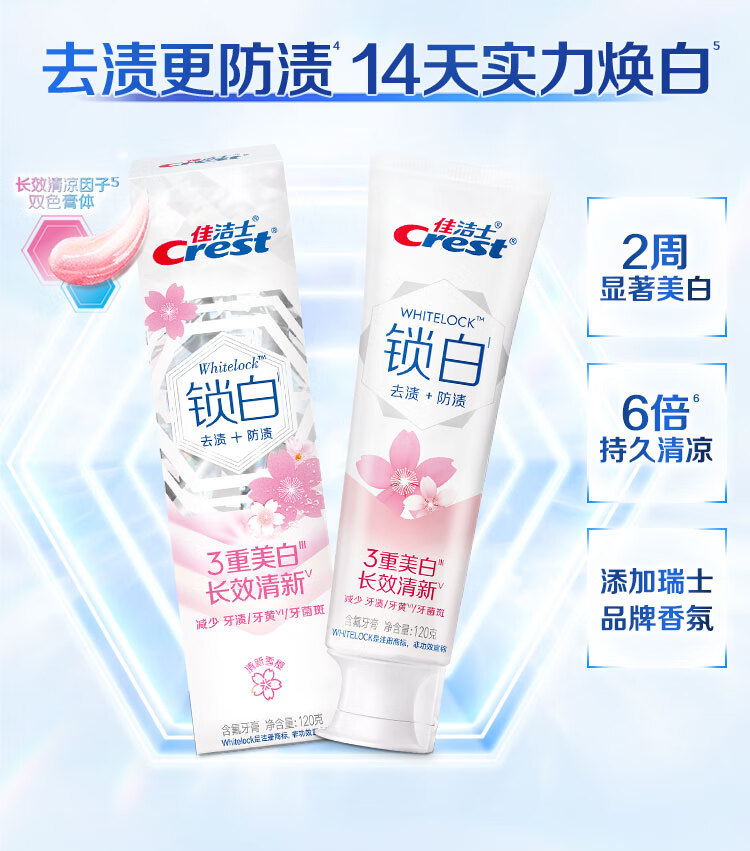 “Crest/佳潔士”清新雪櫻120g 牙膏 1支裝(丁禹兮同款鎖白去漬美白雪櫻120克新老包裝混發(fā))