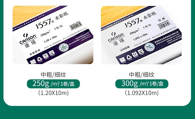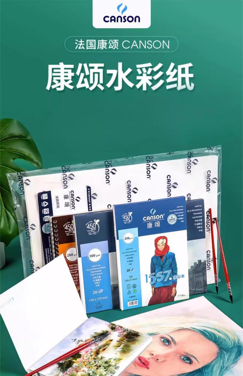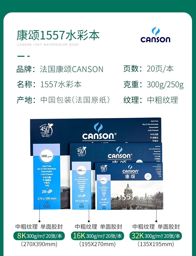 “CANSON/康頌”4k 180g 1557水彩紙 單包裝(素描紙素描本水彩本中粗細紋雙面紋理速寫本彩鉛紙10張/包)