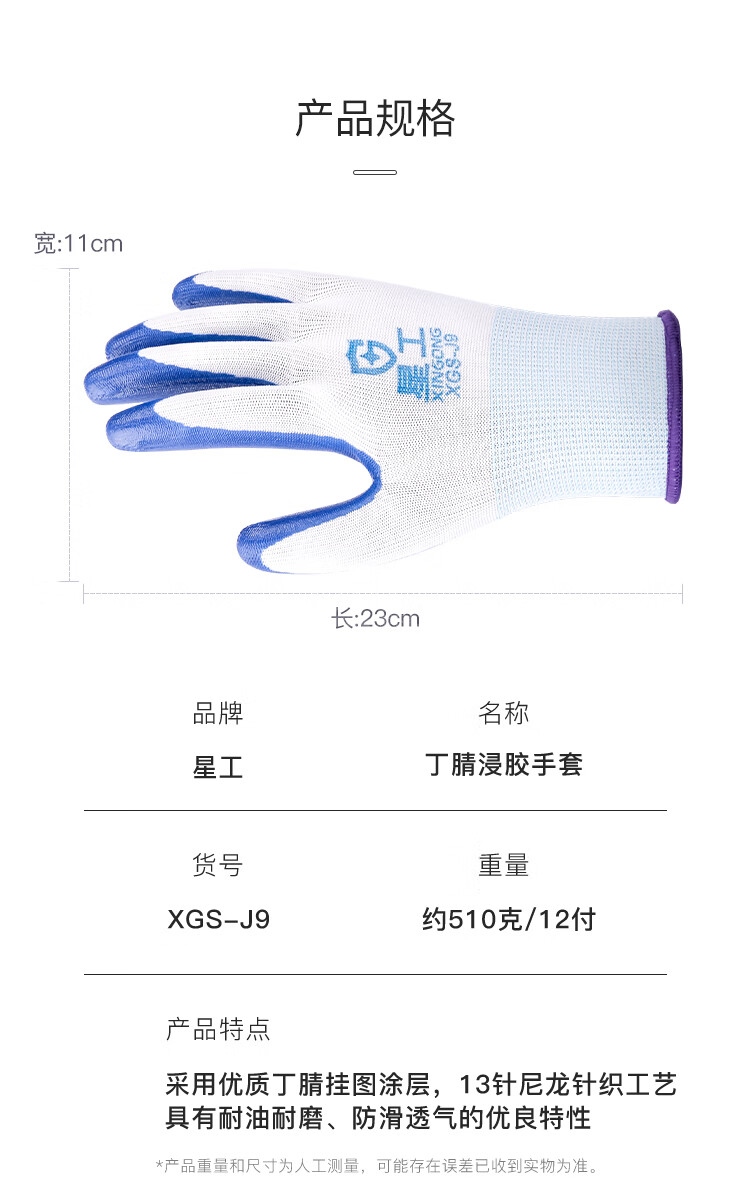 “XINGGONG/星工”XGS-J9 丁腈浸膠手套 單付裝(勞保加厚耐磨防滑掛膠工地搬運(yùn)涂膠汽修建筑12付/包)