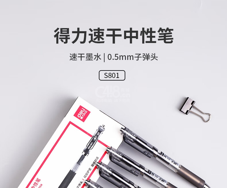 “deli/得力”S801 按動中性筆 1盒裝(黑色速干0.5mm子彈頭學(xué)生刷題筆辦公簽字筆按動筆水筆12支/盒)