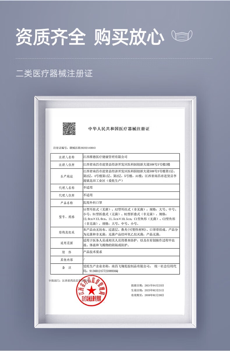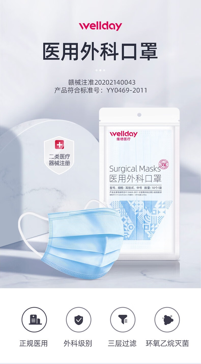 “WELLDAY/維德”A1型耳掛式(無菌) 口罩 單個(gè)裝(一次性醫(yī)用外科透氣防過敏10只/袋100只/包)