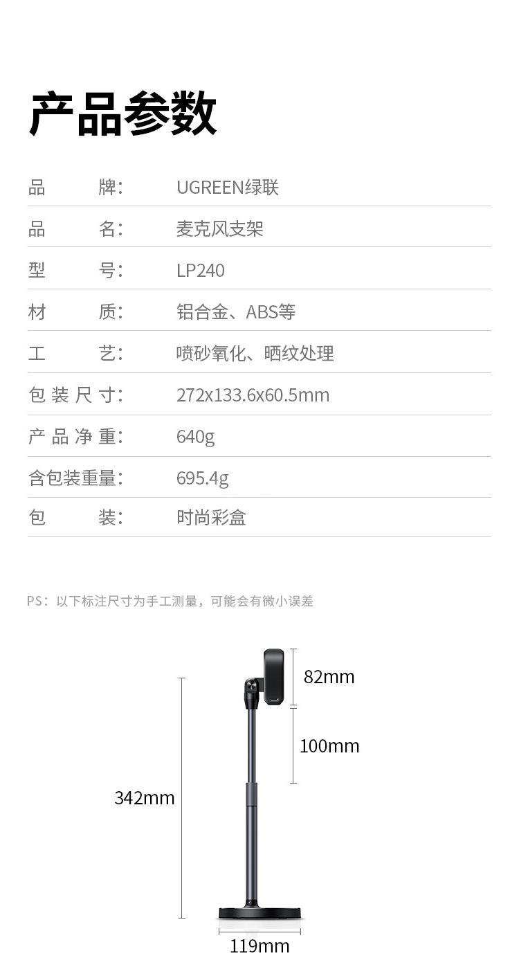 “UGREEN/綠聯(lián)”LP240 10148 麥克風支架 1個裝(桌面話筒支架手機直播K歌麥克風架主播錄音設(shè)備可升降便攜支架桌面麥克風升降支架)